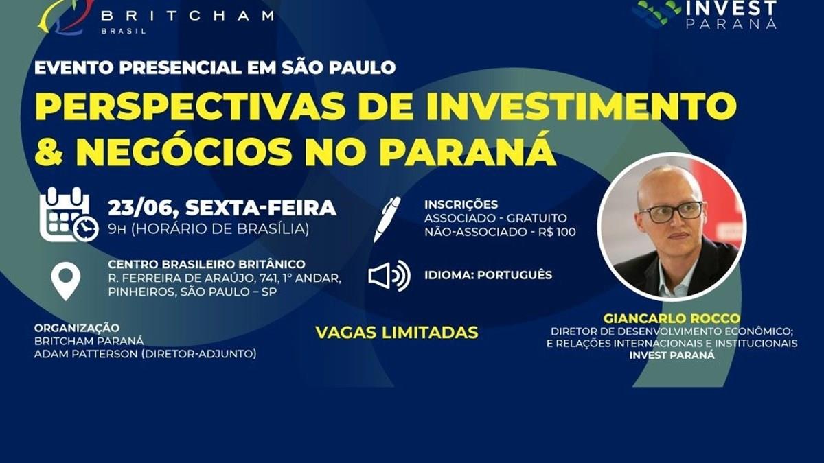 A Câmara Britância de Comércio e Indústria no Brasil, em parceria com a Invest Paraná, irá realizar um seminário presencial em São Paulo para discutir perspectivas de investimentos e negócios no Estado. O intuito é atrair investimentos privados para o Paraná e apresentar as oportunidades que o estado oferece ao investidor.