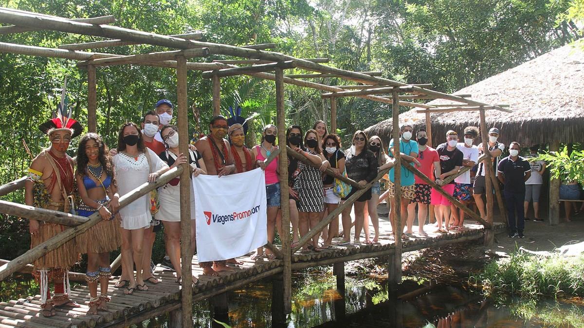 Agentes de viagens mineiros posam para foto na aldeia Pataxó em Santa Cruz Cabrália