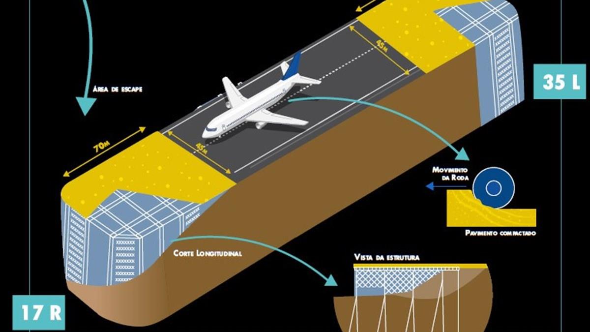 O planejamento da Infraero prevê que a obra seja executada em 16 meses e deixe a pista principal com duas novas áreas de escape – uma de 70m x 45m na cabeceira 17R; e outra de 75m x 45m na cabeceira 35L. As duas estruturas serão sustentadas por vigas e pilares capazes de suportar as aeronaves e veículos.