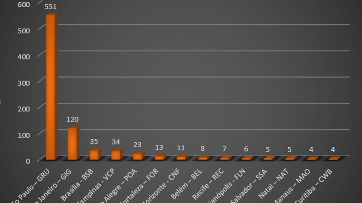 SÃO PAULO/GRU: Tem o melhor índice entre os que ainda não recuperaram os vos, com apenas -19,3%, menos que a média geral do País de 30%. Tinha 683 voos internacionais por semana e está com 551