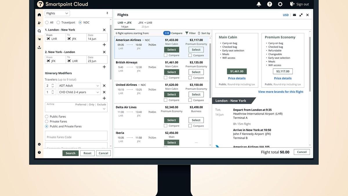 A interface do Smartpoint Cloud fornece melhores critérios para permitir comparações fáceis a partir de qualquer fonte, incluindo tanto o NDC quanto o conteúdo aéreo tradicional, lado a lado. Além disso, as capacidades do Trip Quote aprimoradas integram as ofertas GDS e NDC, permitindo que os agentes apresentem escolhas mais personalizadas e melhores serviços, oferecendo aos viajantes a capacidade de comparar preços mais facilmente. O Smartpoint Cloud também aperfeiçoa as funções de reemissão, automatizando o cálculo de taxas, reduzindo margem de erros.
