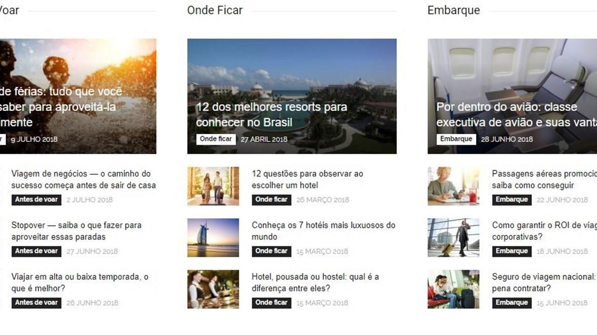 "Embarque Imediato", "Partiu Viajar" e "Descubra" são algumas das principais abas do portal. Na primeira, o leitor terá acesso a dicas do que deve ser observado antes de finalizar as reservas de uma viagem. Na seção “Vem Voar” há artigos sobre os pontos turísticos das principais cidades brasileiras e textos sobre “onde ficar” e “o que explorar” no destino escolhido.