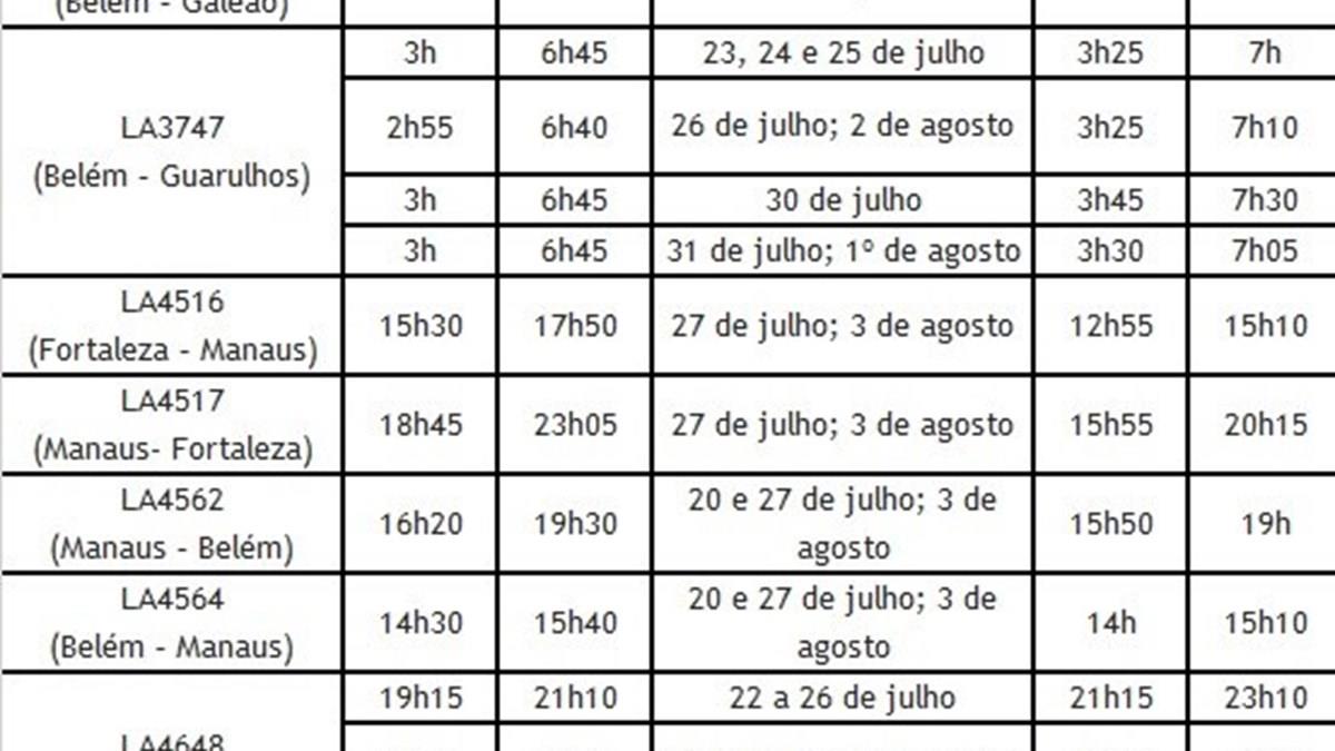 Confira a relação parcial de remanejamentos da Latam em Manaus entre 22 de julho e 5 de agosto: