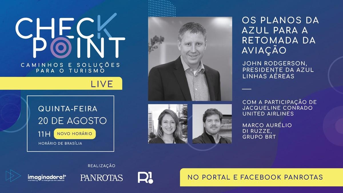 O presidente da Azul Linhas Aéreas, John Rodgerson, é o convidado especial da edição desta semana do “Check Point – Caminhos e Soluções para o Turismo”. A partir das 11h desta quinta-feira, 20 de agosto, o executivo vai destacar os planos da Azul para a retomada da aviação, bem como as mais recentes novidades da empresa, como por exemplo, o lançamento de sua companhia regional Azul Conecta, os próximos passos do codeshare com a Latam e os atributos e produtos que deram à Azul o título de melhor companhia aérea do mundo, segundo o TripAdvisor.