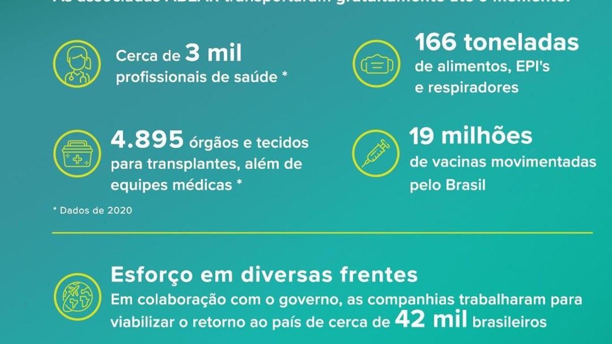 A Abear, Associação Brasileira das Empresas Aéreas, divulgou que em 2020 suas associadas transportaram gratuitamente por volta de três mil profissionais de saúde, mais de 4 mil órgãos e tecidos para transplantes, 166 toneladas de alimentos e equipamentos de proteção individuais, além de 19 milhões de vacinas por todo o território nacional.
