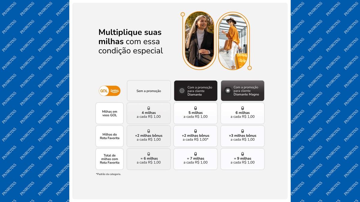 Clientes Diamante Magno poderão juntar até 9 milhas por real gasto — sendo 6 milhas a cada real e outras 3 milhas extras para quem utilizar as rotas cadastradas no benefício Rota Favorita. Já os clientes Diamante passam a acumular 5 milhas por real, com a opção de ter até 2 milhas extras nas suas rotas favoritas, a até 7 milhas por real gasto.