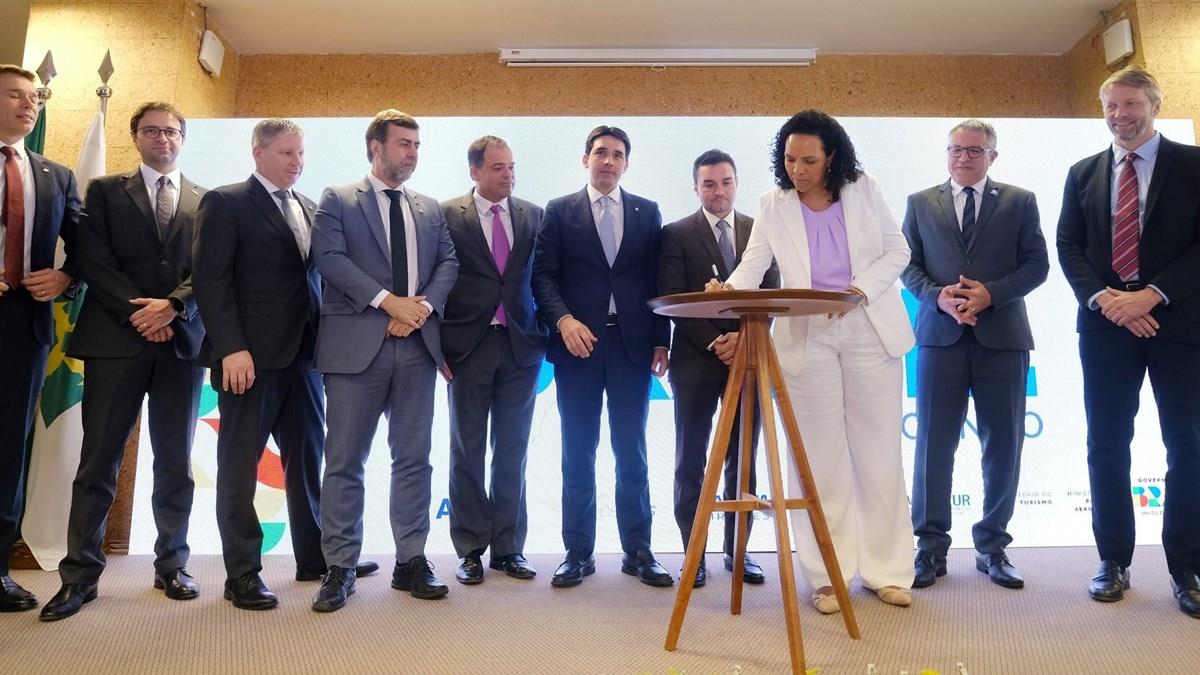 A Associação Brasileira das Empresas Aéreas (Abear) assinou hoje (26), em Brasília, o protocolo de intenções do “Conheça o Brasil: Voando”, iniciativa do Ministério do Turismo (MTur), em parceira com o Ministério de Portos e Aeroportos (MPOR), Abear e as companhias aéreas associadas Gol, Latam e Voepass, mais a Azul, para impulsionar o setor aéreo no País. O programa reúne esforços do governo federal e das companhias aéreas para desenvolver ações voltadas ao estímulo de viagens no Brasil, à democratização do acesso à aviação civil e à redução do custo operacional das empresas aéreas.