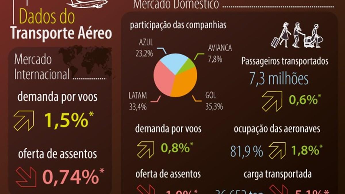 No mês, 7,3 milhões de passageiros foram transportados pelo aéreo nacional, alta de 0,6% em relação ao quarto mês de 2018. A oferta de assentos caiu 1% no mesmo período comparativo, enquanto a demanda cresceu 0,8%.