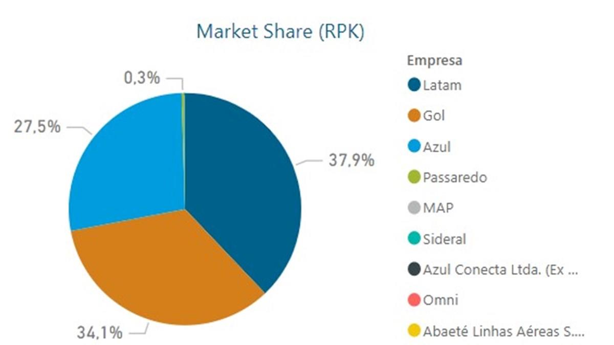 Participação das empresas aéreas nacionais no mercado doméstico nos últimos 12 meses. Fonte: Anac