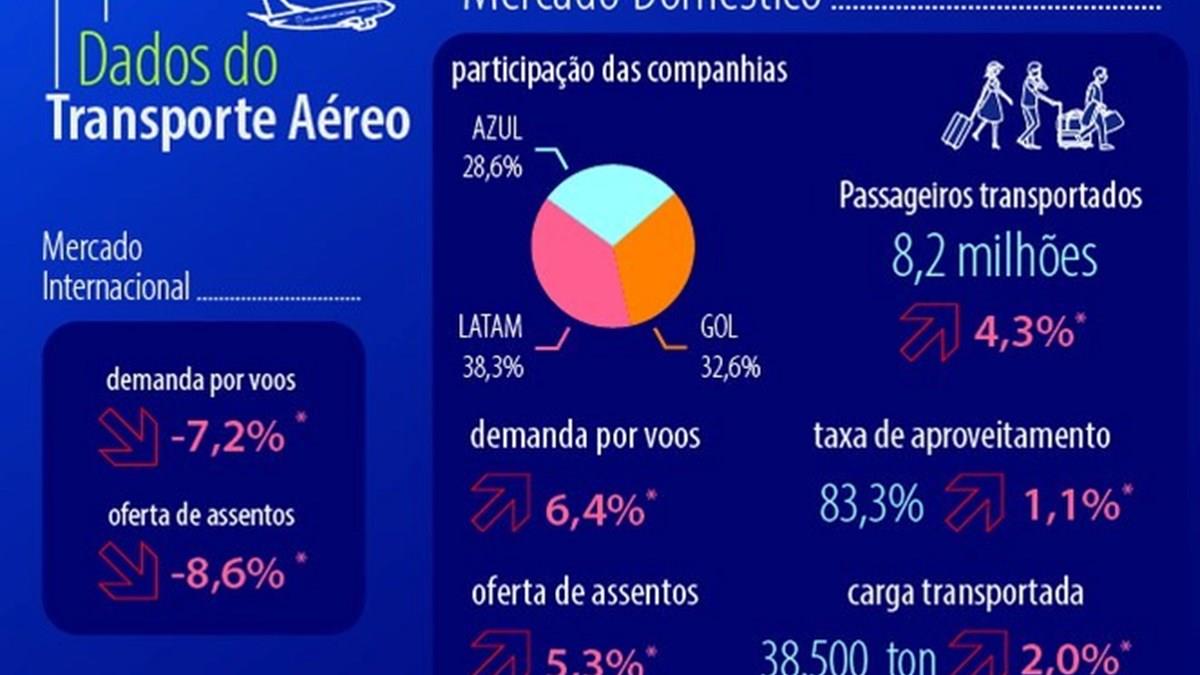 Em nota, a Anac afirma que os resultados do mercado do transporte aéreo brasileiro estão comparados com o ano de 2019, ano pré-pandemia de covid-19, para retratar a realidade do transporte aéreo antes das restrições de mobilidade da população. Os dados monitorados pela ANAC continuarão a ser apresentados nessa base de comparação até o final de 2023. Confira o infográfico: