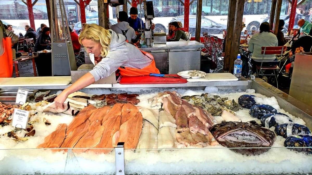 O Mercado de Peixe, com restaurantes simples e apetitosos em pleno Centro de Bergen, é um belo programa. Quase uma obrigação. Se você não gosta de frutos do mar, vá passear... pela orla. Peixes, ostras, camarões e lagostas (precisa citar o salmão, tão típico?) são tão fresquinhos quanto volumosos.