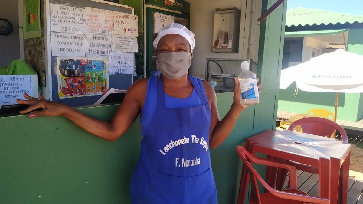 "Poder voltar a trabalhar e ajudar a minha família que depende de mim, só traz felicidade. Estamos respeitando todo o protocolo de prevenção usando álcool gel, luva, máscara, pia para lavar as mãos e distanciamento adequado entre as mesas. Que essa pandemia passe logo para tudo voltar ao normal", afirma a comerciante Regina Ventura.