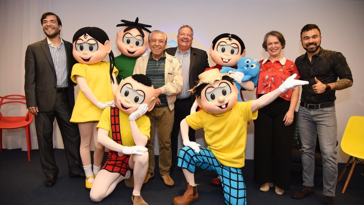 Marcelo Bento, Mauricio de Sousa, DT Minich, Ana Flavia Medina e Mauro Sousa com a Turma da Mônica durante lançamento da campanha