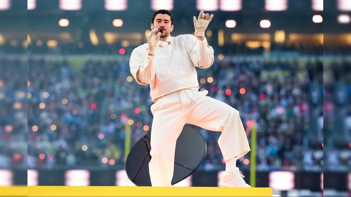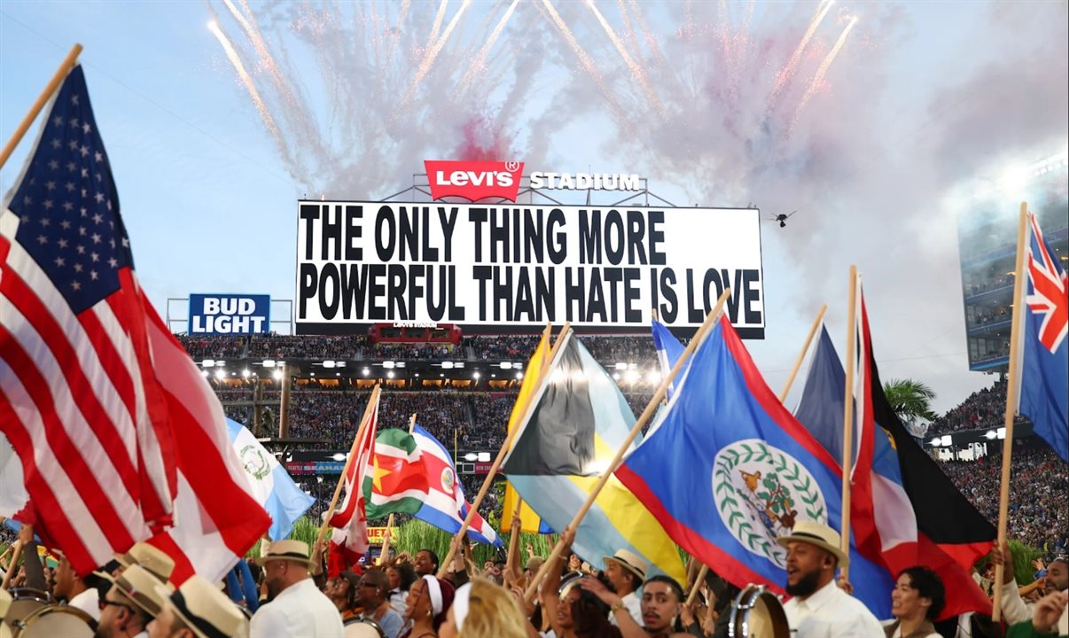 Benito Antonio Martinez Ocasio, o Bad Bunny, finalizou a apresentação com uma bola de futebol americano nas mãos que dizia “Juntos, somos América”, ao lado de bailarinos que seguravam as bandeiras de todos os países das Américas: do Sul, Central e do Norte.
