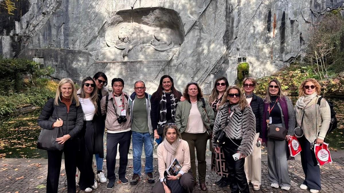 O desembarque em Lucerna marcou o início de um city tour guiado pela brasileira Claudia, que conduziu o grupo pelos principais pontos turísticos e históricos da cidade. Pelas ruas de paralelepípedo do centro histórico, os visitantes exploraram Kapellbrücke, a mais antiga ponte de madeira coberta da Europa, decorada com pinturas que retratam cenas da história local. O roteiro seguiu até a imponente Torre de Água, símbolo da cidade, e a elegante Igreja Jesuíta, um dos mais belos exemplos do estilo barroco na Suíça.