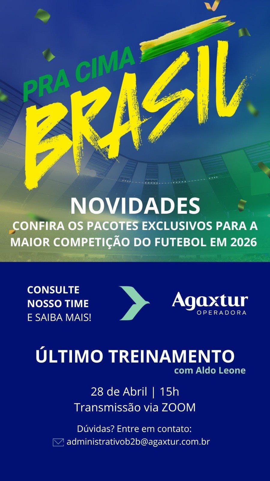 A Agaxtur informou que ainda conta com opções de pacotes terrestres para os jogos do Brasil na fase inicial, além de oportunidades para a final, após a liberação de vendas de hospitality avulso. Segundo o CEO do grupo, Aldo Leone Filho, houve um aumento relevante na procura recente, especialmente entre viajantes que decidiram se programar de última hora para garantir lugar nas partidas decisivas.