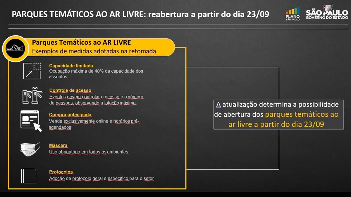A autorização vale apenas para os parques ao ar livre e protocolos de saúde e segurança terão que ser obedecidos. "Funcionários e visitantes terão que, obrigatoriamente, usar máscaras e ter a temperatura medida na entrada desses complexos", reforçou o governante. A fiscalização dessas práticas fica por conta de cada prefeitura.