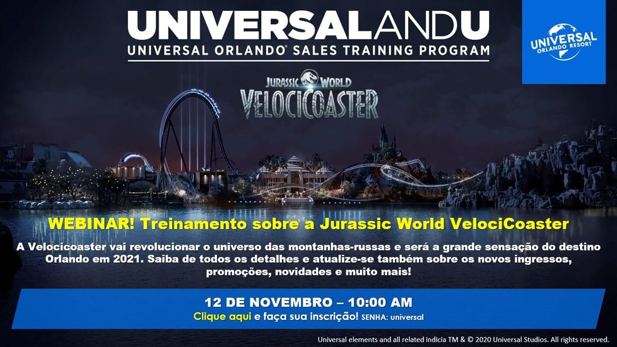 Nesta quinta-feira (12), às 10h, a Universal Parks & Resorts irá promover um treinamento temático para os agentes de viagens. O webinar será focado nos detalhes da Jurassic World VelociCoaster, a nova atração do complexo Universal Orlando Resort, com inauguração prevista para o verão norte-americano de 2021.