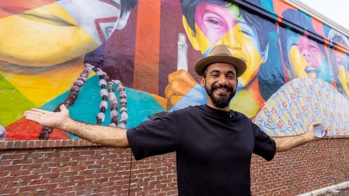 Muralista brasileiro expõe sua obra em um mural de 29 metros de comprimento por 5 metros de altura