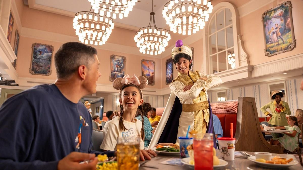 - Os visitantes podem encontrar a Princesa Tiana vestida para uma aventura e Aladdin em seu traje de príncipe, junto com Mirabel e Cinderela, enquanto eles aparecem durante o café da manhã e o jantar.
