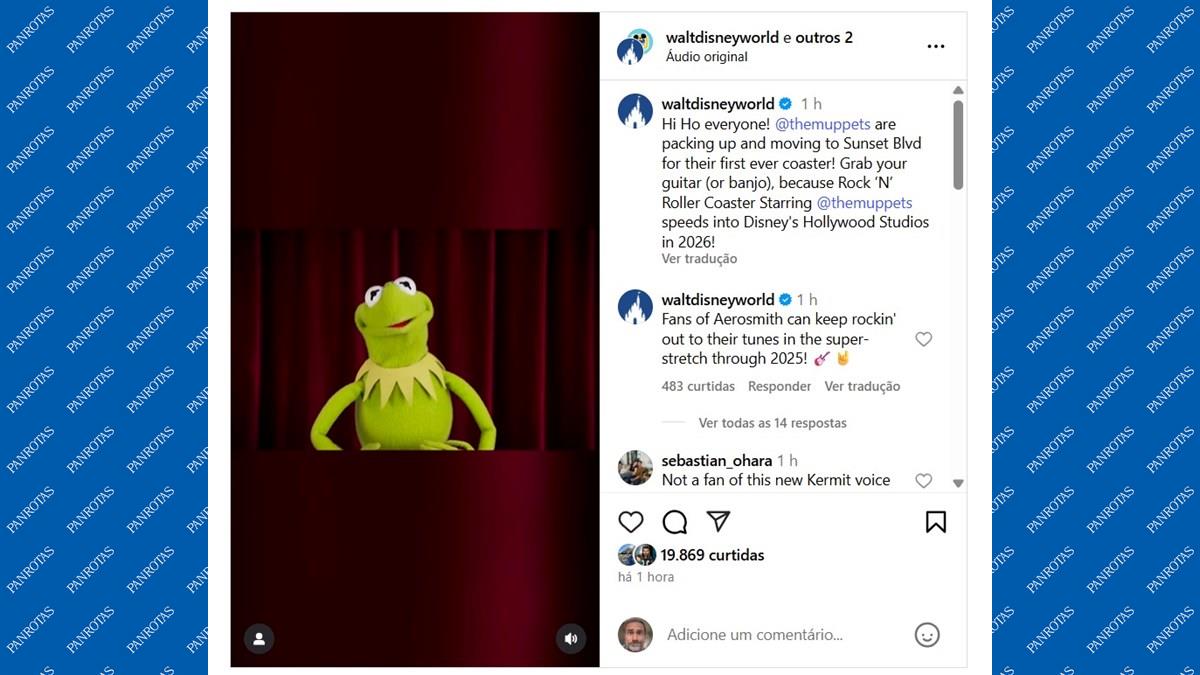Hoje, Kermit invadiu o Instagram da Disney para anunciar que os fãs de Aerosmith têm até o final do ano para matar a saudade, pois em 2026 (não há ainda a data específica) a primeira Muppet Coaster será aberta no Hollywood Studios.