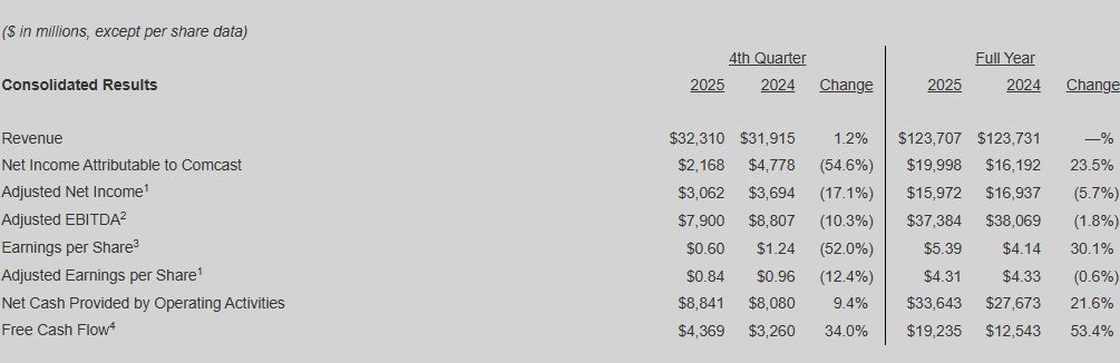 A Comcast anunciou hoje (29) os resultados operacionais e financeiros referentes ao quarto trimestre e ano de 2025, findo em 31 de dezembro, com destaque para um lucro líquido de US$ 19,9 bilhões, crescimento de 23,5%, além de um EBITDA ajustado de US$ 37,4 bilhões no ano completo de 2025.