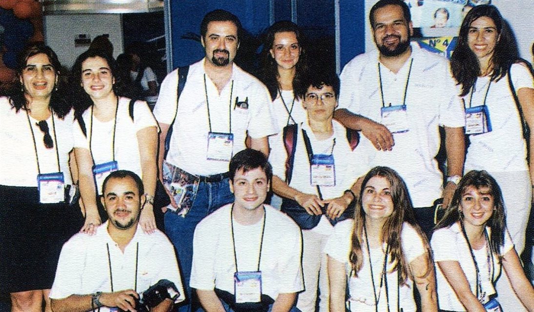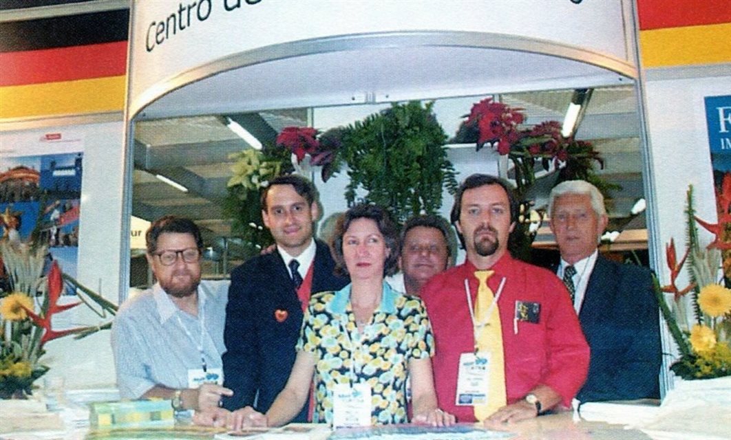 1999, em Curitiba: Giovanni Lenard, do Centro de Turismo Alemão, é o coordenador do estande da Alemanha, onde estão vários operadores. Na foto com Giovanni estão Oskar Kedor, da Sixt Rent a Car, Washington Junior, da Trend Operadora, Angélica Schickler, do Turismo Alemão, Pablo Bernhard, da TT Operadora, e Armindo Robinson, da Socaltur