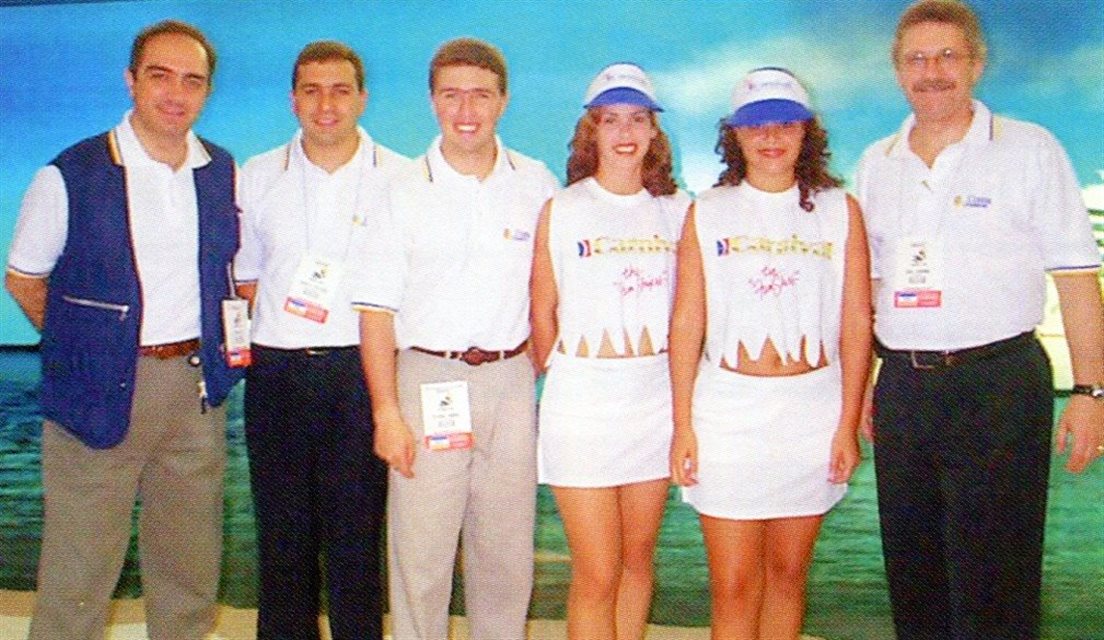 1998: No estante da Costa Cruzeiros, que naquele ano passava a representar a Carnival no Brasil: Francisco Ancona Lopes, Sergio Trevisan, Ricardo Amaral, Karina Karla e Rene Hermann