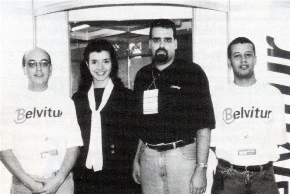 1998: Apesar de ter filiais em outras cidades, nesta foto da Belvitur o pessoal da matriz belorizontina predominava, começando pela gerencia comercial Aguinel Rabelo, a recepcionista Elisângela, o diretor geral Marcelo Cohen e o atendente Giovane Montini
