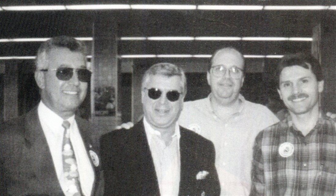 1998: Juarez Cintra, da Ancoradouro, confraterniza com a equipe da Rio Sul, que divulgava a nova marca da companhia aérea e a Ponte Aérea que opera em parceria com a Varig. Da esquerda para a direita: Paulo Torreão, Juarez Cintra, Otoniel Garcia e Marcos Telore, na feira da Abav no Recife