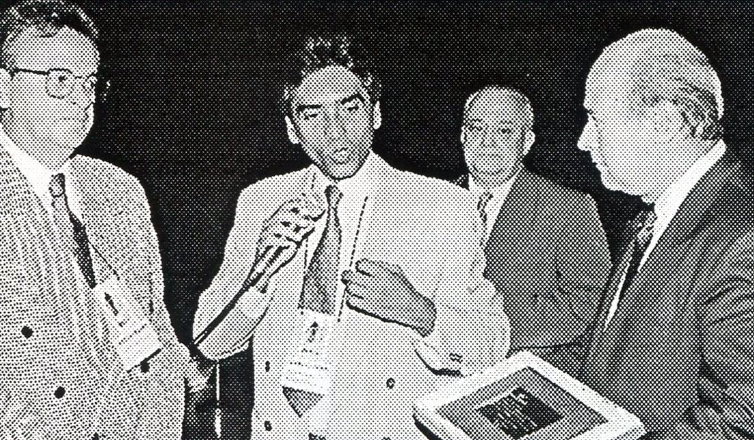 1996: Após a entrega de homenagem a José Guillermo Condomí Alcorta, Sérgio Nogueira enaltece a atuação da PANROTAS e de seu diretor-presidente, enquanto é observado por Goiaci Alves Guimarães, diretor financeiro da Abav