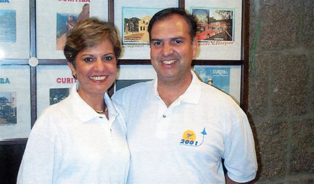 1999, em Curitiba: Carlos Alberto de Sá, presidente da Abav do Distrito Federal, e sua esposa, Teresa Cristina Azevedo, na entrada do restaurante Veneza, onde aconteceu a Festa da Abav do Distrito Federal