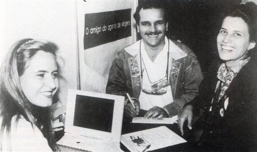 1993, em Foz do Iguaçu: O sistema de reservas Galileo sendo demonstrado por Maria Luiza Rodenbeck e Luiz Moura Jr, em parceria com a United Airlines, no mesmo estande