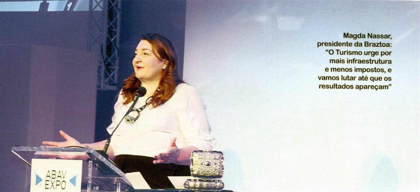 Em 2017, Magda Nassar era presidente da Braztoa: "Turismo urge por mais Infraestrutura e menos Impostos, e vamos lutar até que os resultados apareçam", disse ela na abertura da Abav Expo, em São Paulo
