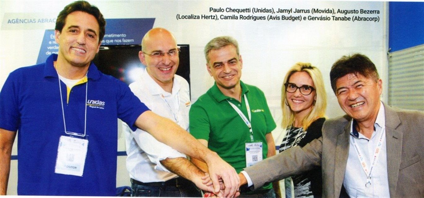 Abav Expo 2017, em São Paulo: Paulo Chequetti (Unidas), Jamyl Jarrus (Movida), Augusto Bezerra (Localiza Hertz, Camila Rodrigues (Avis Budget) e Gervásio Tanabe (Abracorp)