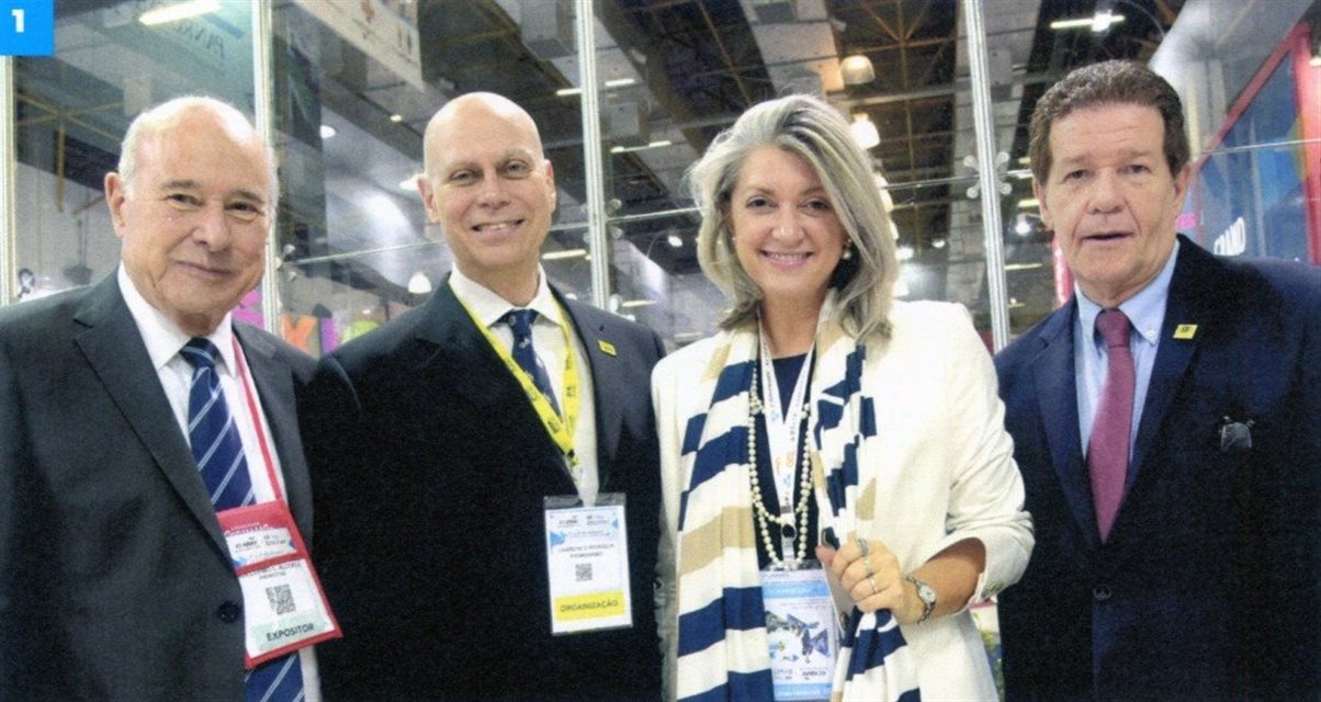 Em 1993, estande da Agaxtur em Foz do Iguaçu: Aldo Leone Filho, seu pai Aldo Leone, Malu Ferraz, Estanislao Arce, do Hotel Casino Yacht Golf Club Paraguayo, e Oscar Cervigni