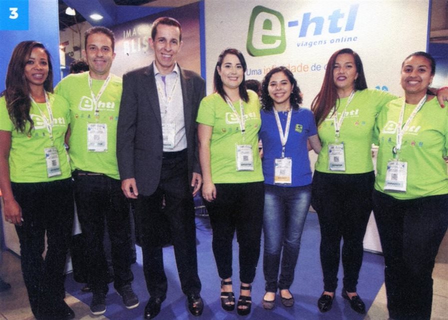 Equipe E-HTL em 2017, na Abav Expo em São Paulo: Letícia Arruda, Leonardo Arruda, Flávio Louro, Veronica Barreta, Letícia Svizzero, Kelly Moraes e Jennifer Fernandes