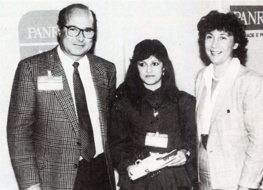1990, Porto Alegre: José Guillermo Condomí Alcorta e Maria Tereza Lobo, presidente e diretora de Promoções da PANROTAS, respectivamente, recebendo a visita de Margareth Castro Vieira, do Visit USA Information Office, de São Paulo