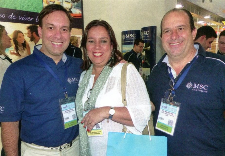 2014, São Paulo: Adrian Ursilli e Waldir Munhoz, da MSC Cruzeiros, com a agente de viagens Elisa Agra, da Valencia Turismo