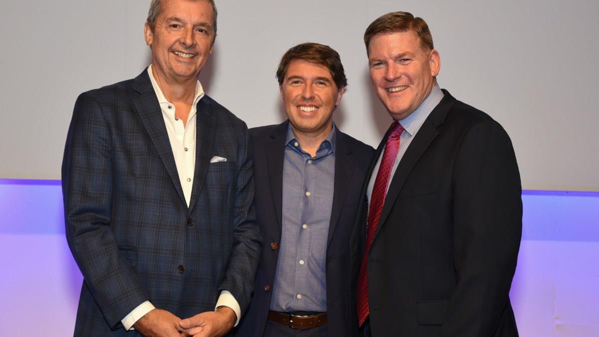 Ricardo Amaral, da R11 Travel, entre Michael Bayley e Gavin Smith, da Royal Caribbean