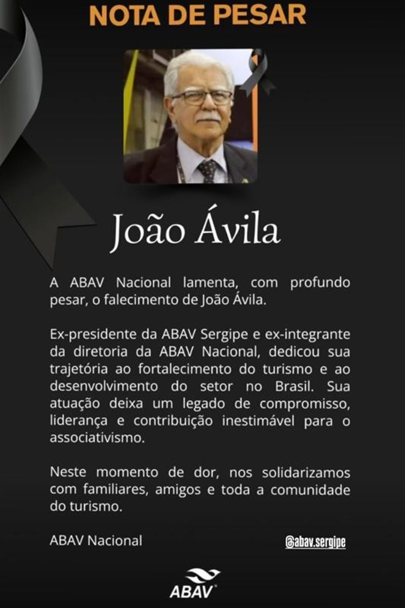 A Abav Nacional comunicou, com profundo pesar, o falecimento de João Ávila, ex-presidente da Abav Sergipe e ex-integrante da diretoria nacional da entidade.