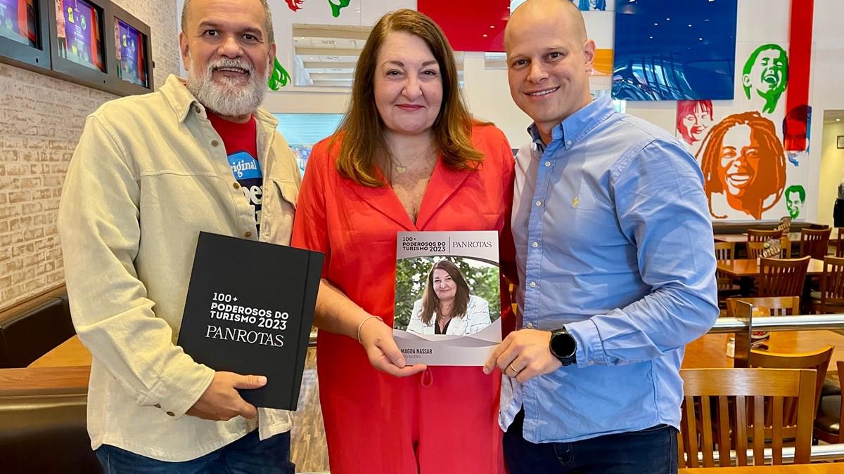Magda Nassar foi mais uma a receber em mãos sua placa de 100+ Poderosos do Turismo 2023 (veja a lista completa aqui). O CEO da PANROTAS, José Guilherme Alcorta, com o CCO e editor-chefe da empresa, Artur Luiz Andrade, entregaram a homenagem a Magda na tarde desta terça (12), em São Paulo.