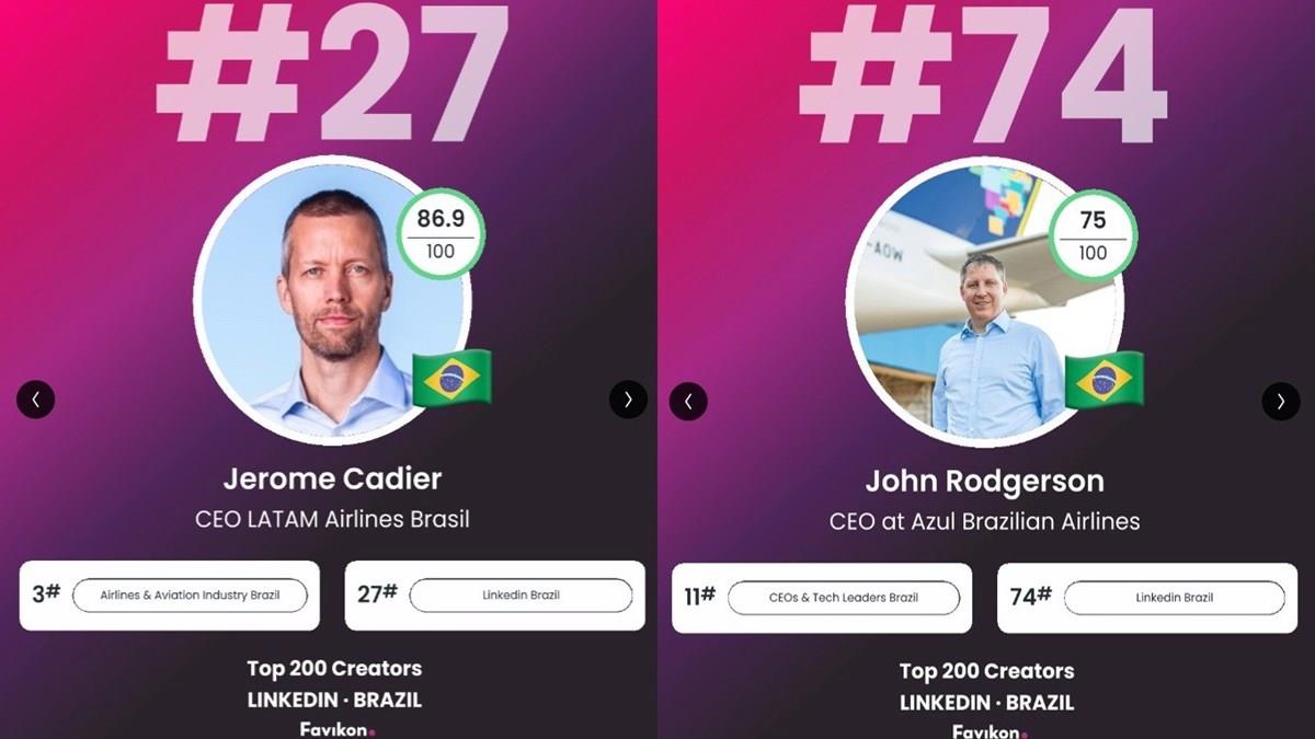 Em uma recente divulgação feita pela Favikon, Jerome Cadier, CEO da Latam, e John Rodgerson, CEO da Azul, foram listados entre os 100 brasileiros mais influentes no LinkedIn. O ranking, que celebra personalidades destacadas em diversas áreas, incluiu os dois líderes no segmento de "Business & Startups".