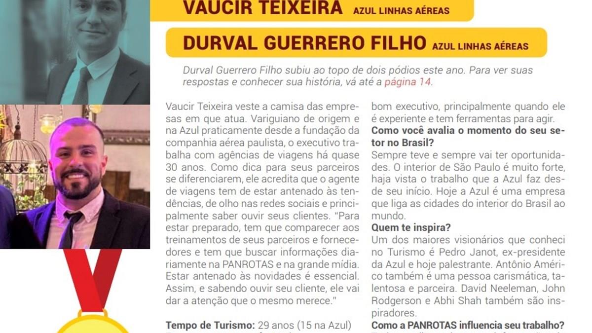 Vaucir Teixeira e Durval Guerrero Filho, da Azul, subiram juntos ao lugar mais alto do pódio na eleição dos Melhores Promotores de Vendas do Turismo PANROTAS 2024, categoria Aviação Nacional - Interior e Litoral de São Paulo.