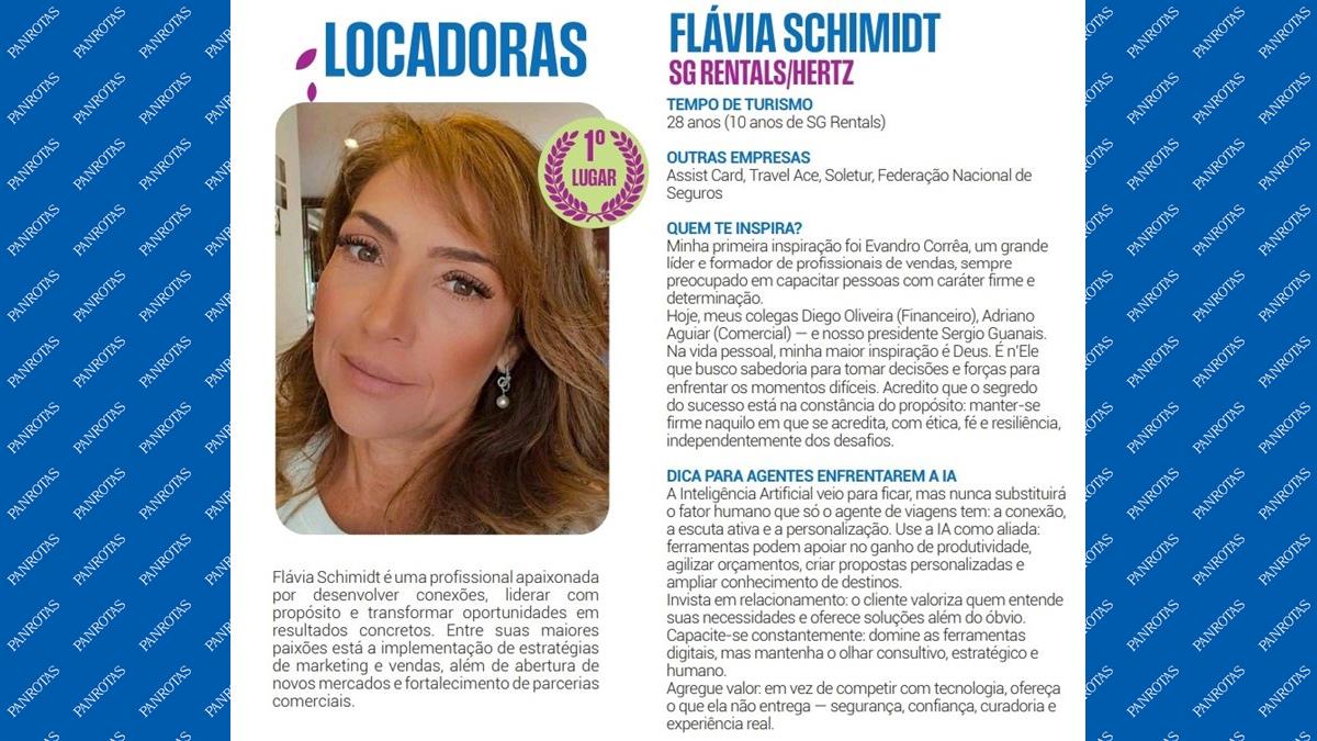 Flávia Schimidt, campeã na categoria Locadoras de Veículos no Rio de Janeiro no Melhores Promotores de Vendas PANROTAS 2025, é uma profissional apaixonada por desenvolver conexões, liderar com propósito e transformar oportunidades em resultados concretos.