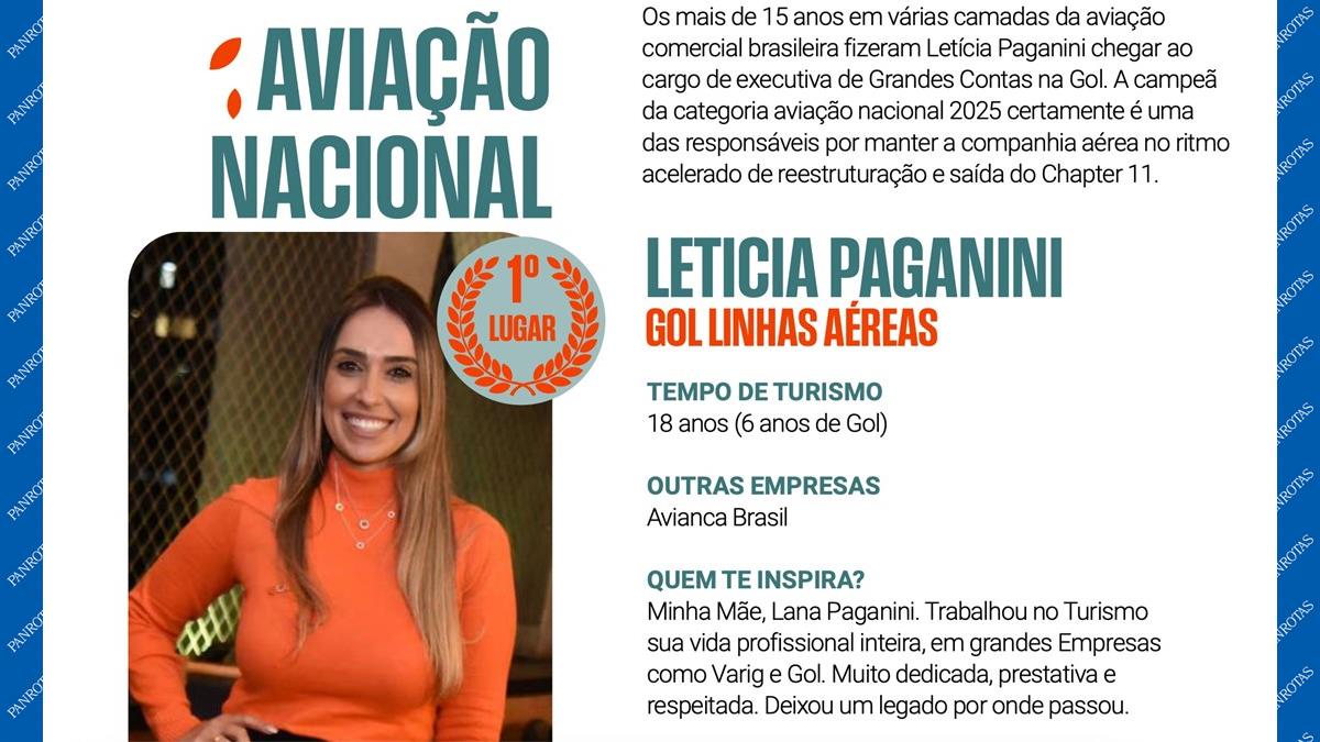 Com mais de 15 anos de experiência em diferentes áreas da aviação comercial brasileira, Letícia Paganini alcançou o posto de executiva de Grandes Contas na Gol, onde atua há seis anos. A profissional soma 18 anos dedicados ao Turismo e acaba de ser eleita campeã na categoria Aviação Nacional para o mercado de São Paulo no prêmio Melhores Promotores de Vendas PANROTAS 2025.