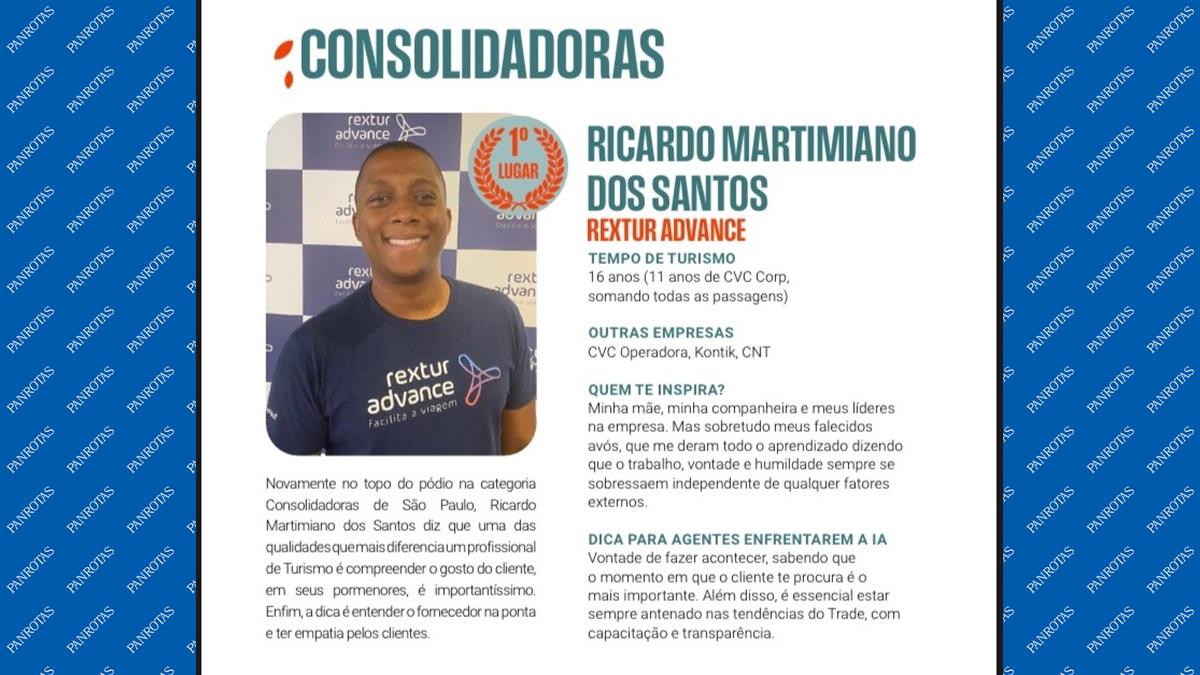 Bi-campeão! Pelo segundo ano consecutivo, Ricardo Martimiano dos Santos, da Rextur Advance, é o vencedor da categoria Consolidadoras São Paulo no prêmio Melhores Promotores de Vendas PANROTAS.