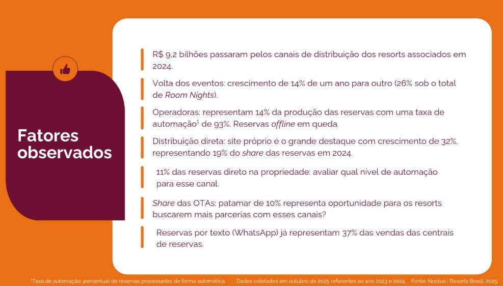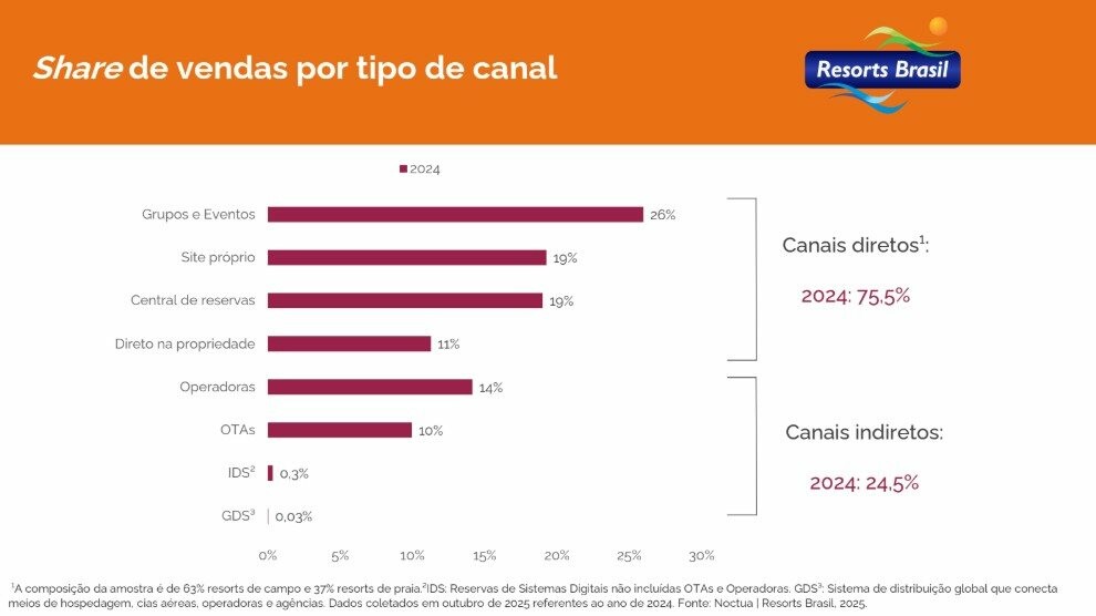 O estudo contou com a participação de 33 empreendimentos associados à Resorts Brasil, somando cerca de 10 mil apartamentos distribuídos em 26 cidades brasileiras. O material analisa 12 variáveis estratégicas relacionadas à performance dos canais próprios – como sites oficiais e centrais de reservas – além da atuação de intermediários, incluindo OTAs e operadoras. O estudo acaba de ser lançado, mas os dados são referentes a 2024.