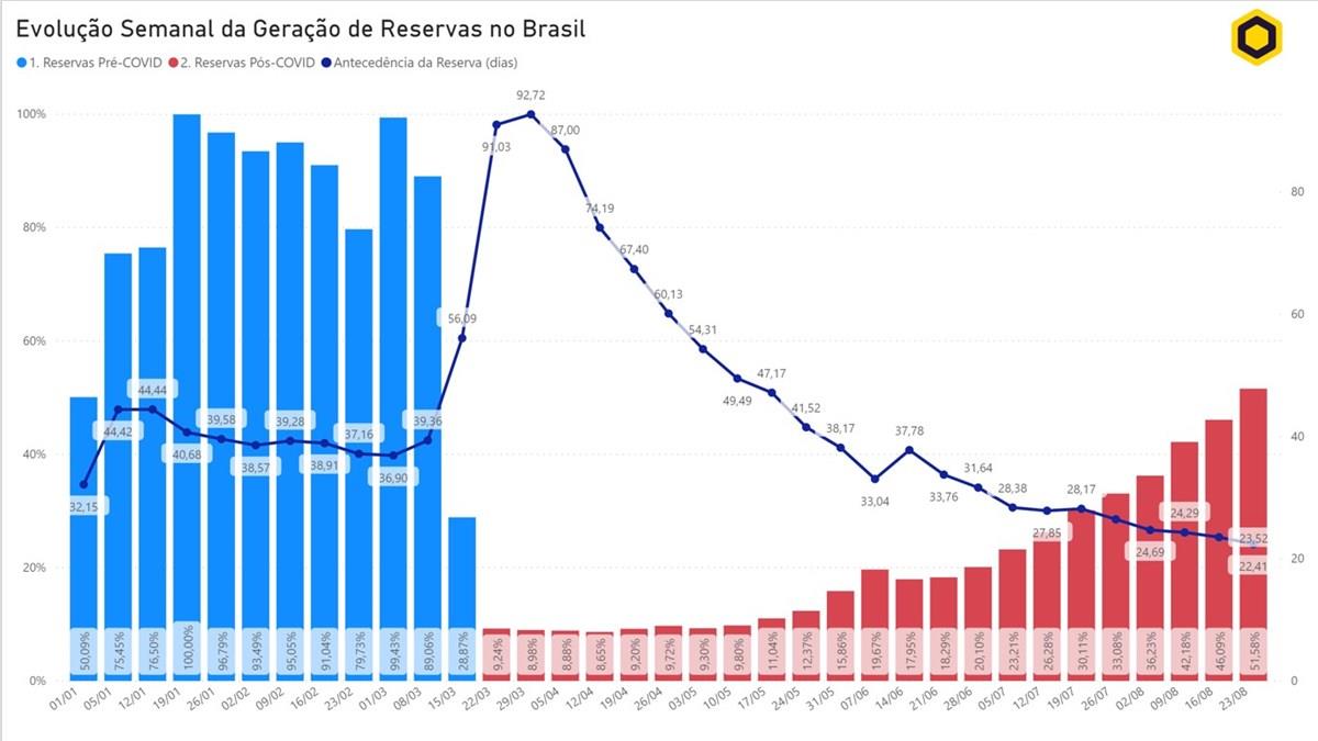 “O principal indicador que avaliamos é o [% Reservas/Semana de Pico], que considera como ponto de referência a semana em que houve mais reservas no ano corrente até o momento e mede em que percentual desse referencial está a geração de novas reservas a cada semana”, acrescenta ele. Confira na imagem abaixo.