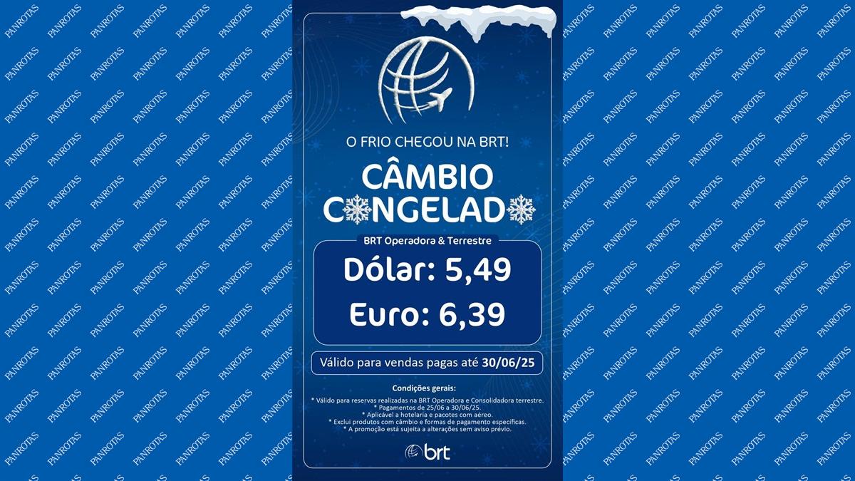 A BRT lançou uma campanha promocional de câmbio congelado, oferecendo taxas fixas para dólar e euro até o final de junho. Com o slogan “O frio chegou na BRT!”, a empresa estabelece valores de R$ 5,49 para o dólar e R$ 6,39 para o euro em reservas confirmadas com pagamento entre os dias 25 e 30 de junho de 2025.